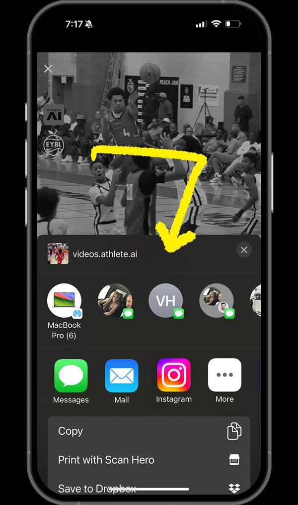 Athlete.AI OFFERS SO MANY WAYS TO SHARE YOUR REEL. Send it via text, airdrop it to a friend, post it on social, or drop it in the team group chat. Athlete.AI gives you native sharing options so your highlights go wherever they need to go — instantly.