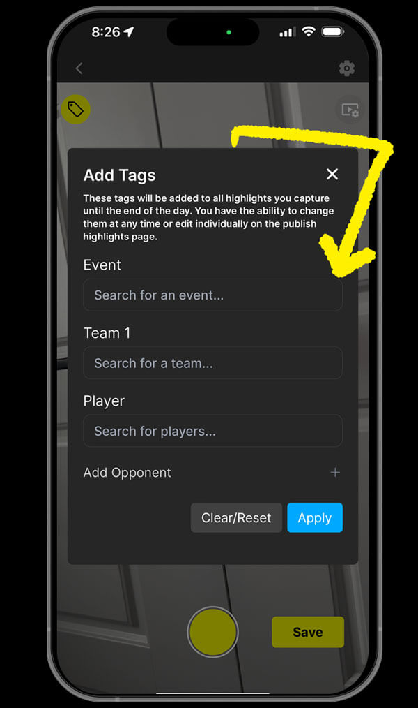 Athlete.AI will tag your videos as you record to unlock the power of ai. Select your Event, Team, and Player to have Athlete.AI tag your athlete.